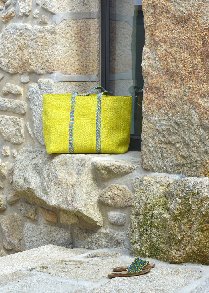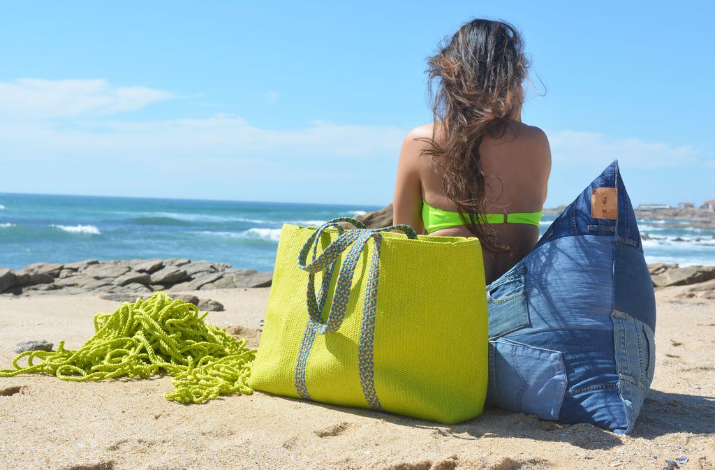 Saco de praia em tom lima com alças coloridas.